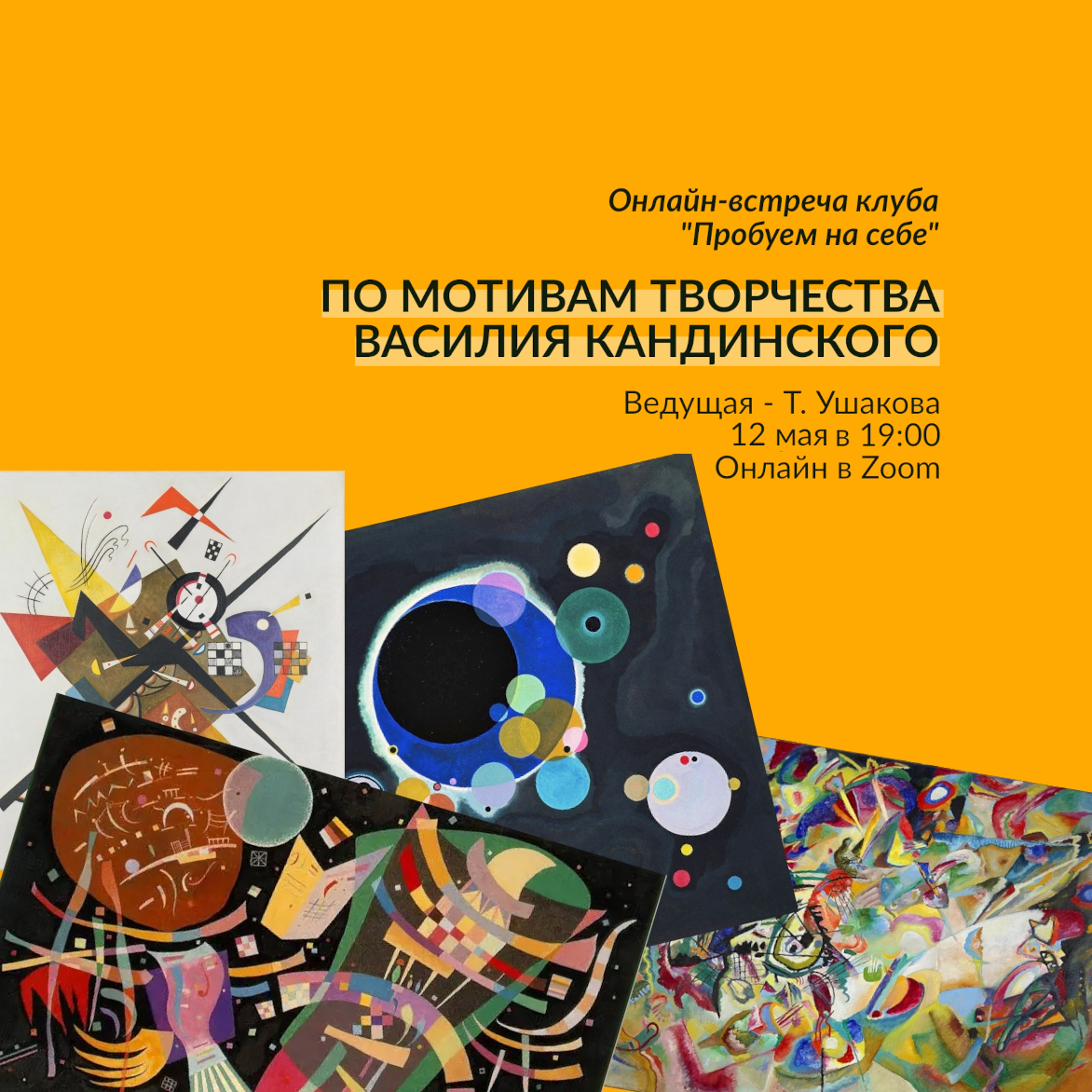 12 мая в 19:00 ждем вас на онлайн-встрече клуба "Пробуем на себе". Тема - "По мотивам творчества В. Кандинского"